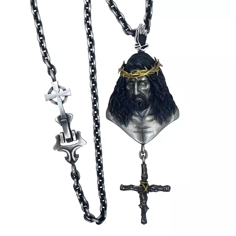 At its heart, the pendant features Jesus adorned with a golden crown of thorns, symbolizing sacrifice and redemption. Intricately openworked on his back is a golden chalice, representing the Eucharist and spiritual nourishment. Below, a cross pendant hangs gracefully, a poignant reminder of faith and salvation.